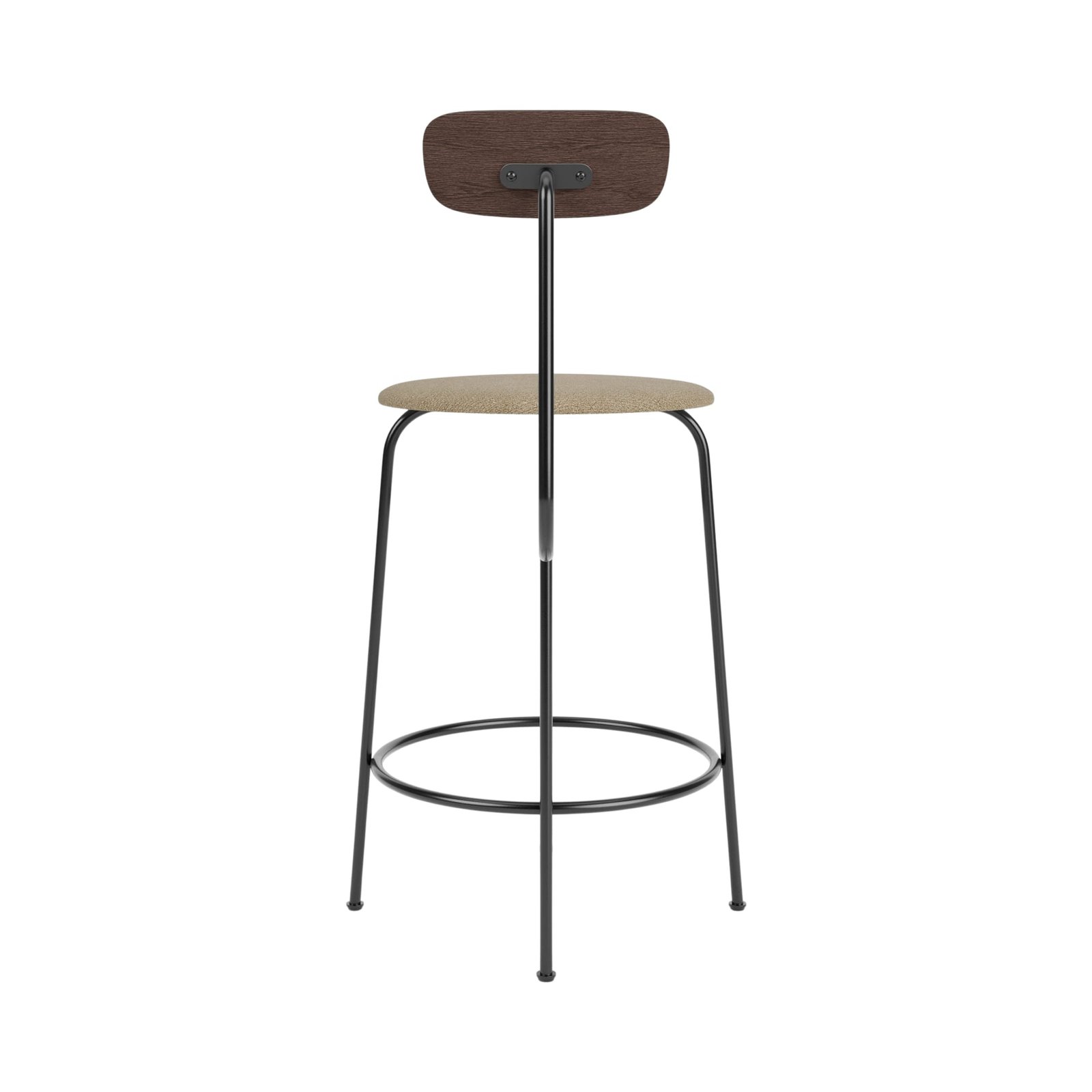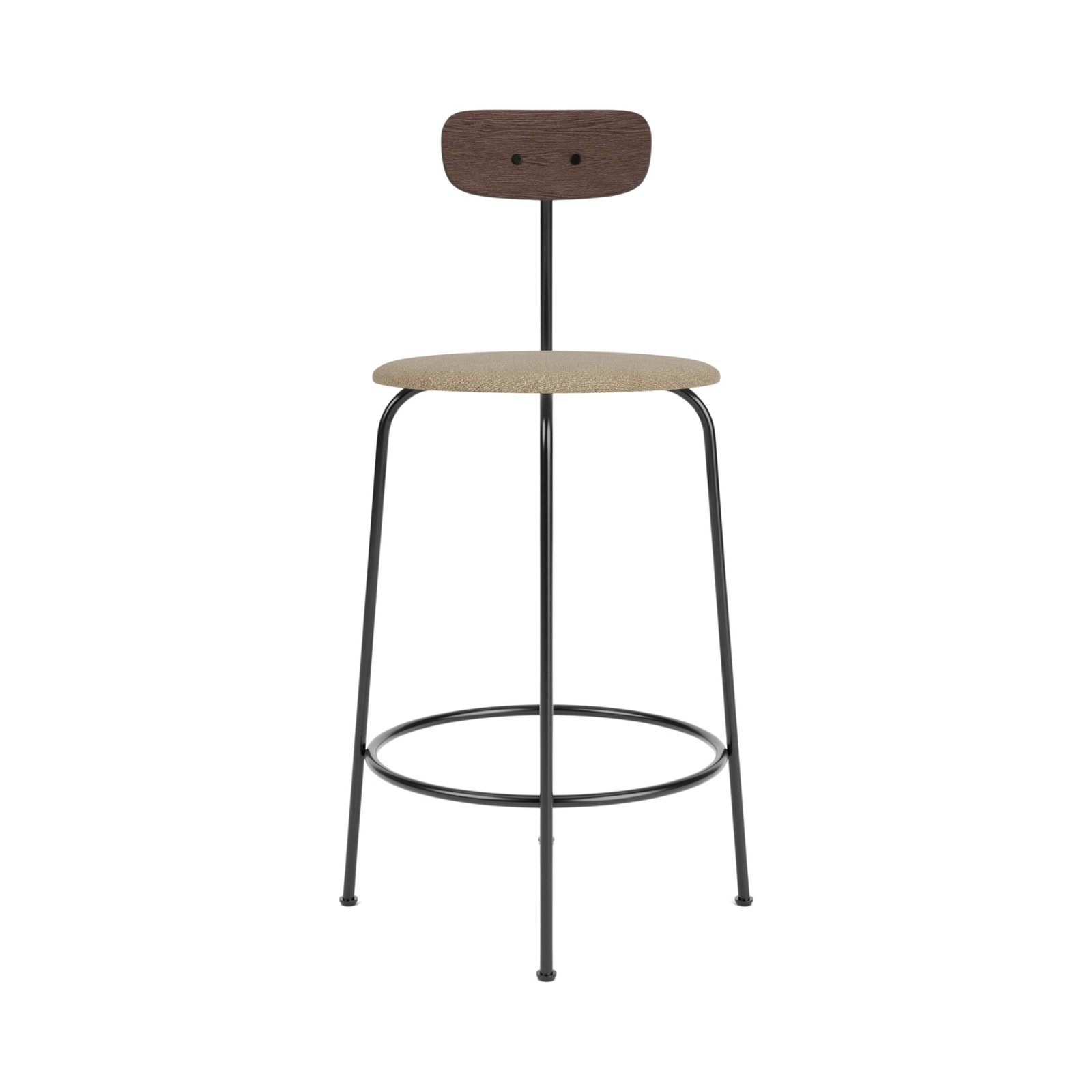 The base is made from bent, welded steel tubes with a powder-coated finish. The backrest is made from plywood with a veneer finish, while the seat is upholstered with foam and fabric.