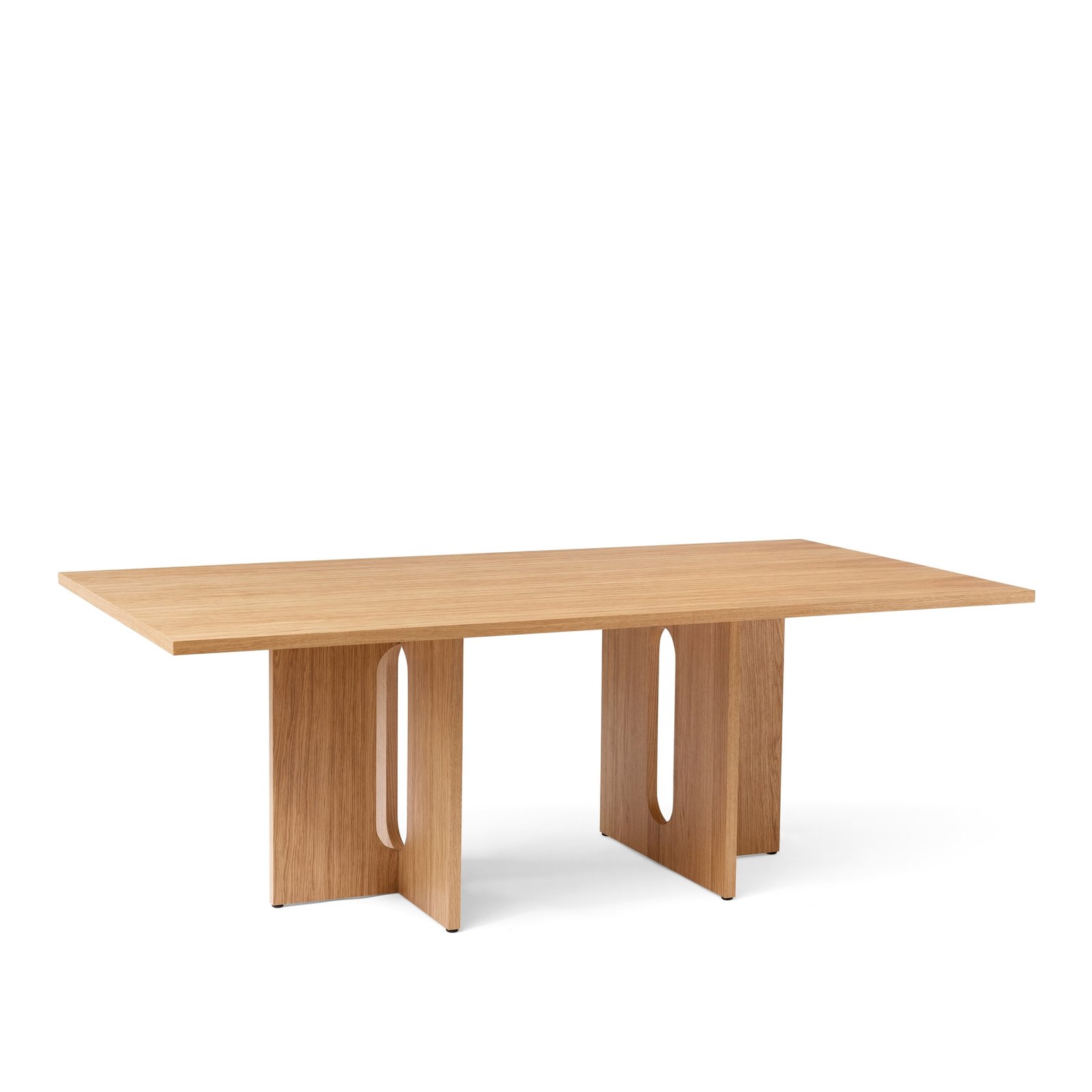 Androgyne Dining Table features a wood base with either a wood tabletop or a marble tabletop. It is made of CNC-cut MDF with oak veneer or hand-polished stone. The table includes CNC-cut steel fittings with a powder-coated finish. Being composed of natural materials, each product is unique, and the surface may vary compared to the images.