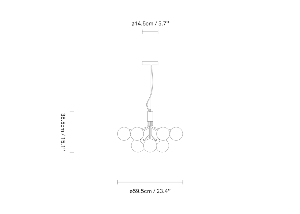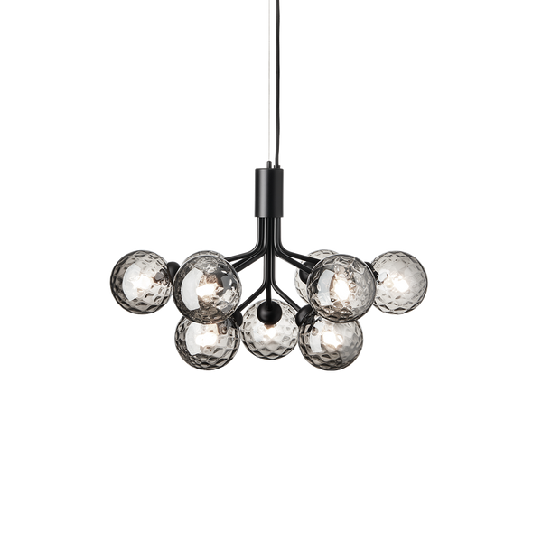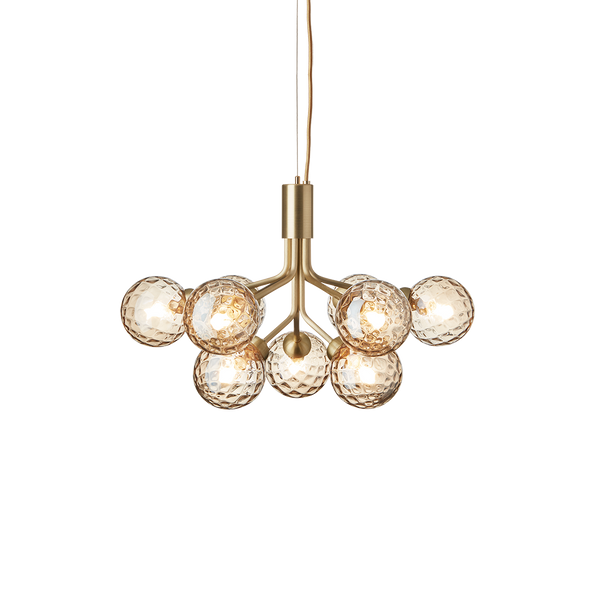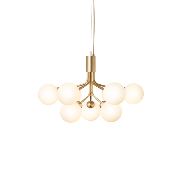 With inspiration from flowers, Sofie Refer has designed the Apiales collection. The collection consists of two chandeliers with 9 or 18 mouth-blown glass globes and is available in golden Brushed Brass  finish or the smooth Satin Black. From a specially-produced canopy, the arms unfold like flower stalks from which light is spread with grace. Apiales 9, with its 60 cm in diameter, fits over the dining table, in the bedroom, or in the hall. Ceiling plate included.