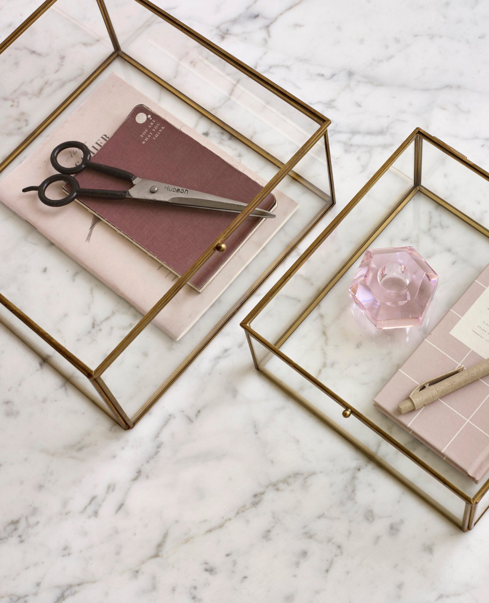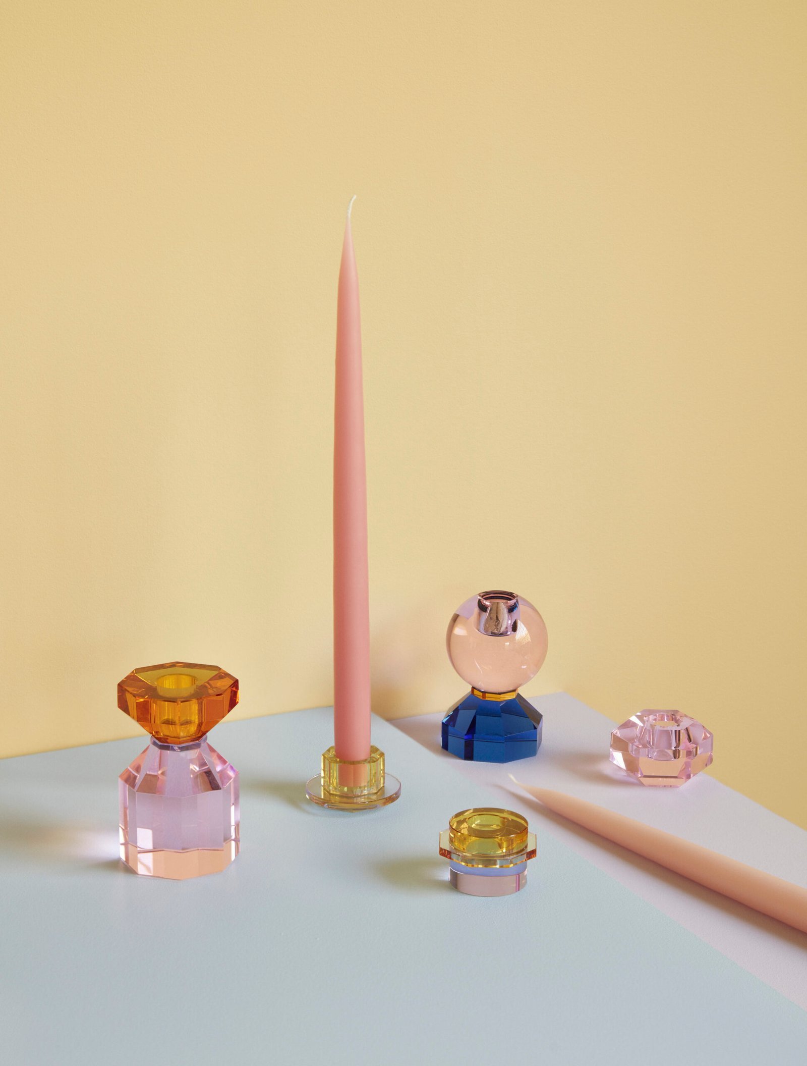 To lysestager i facetslebet pink og røgfarvet krystalglas.