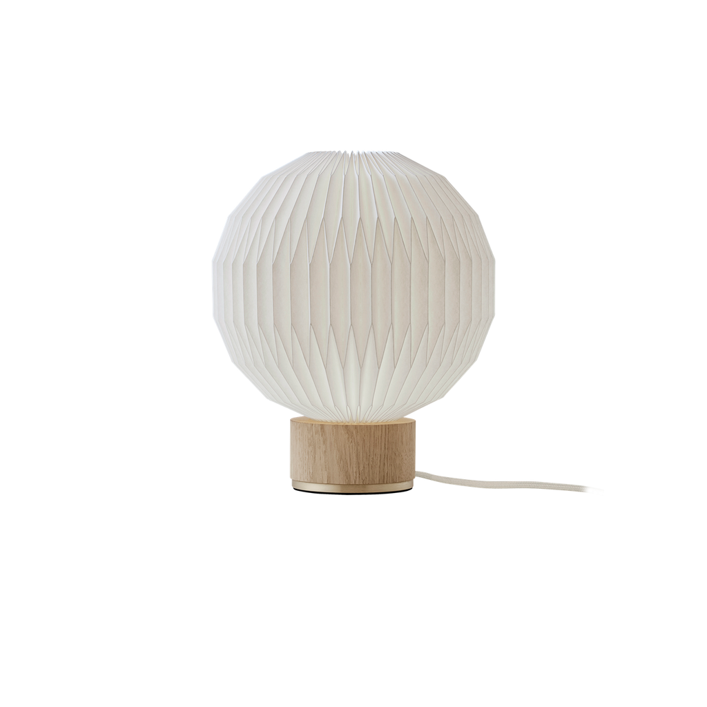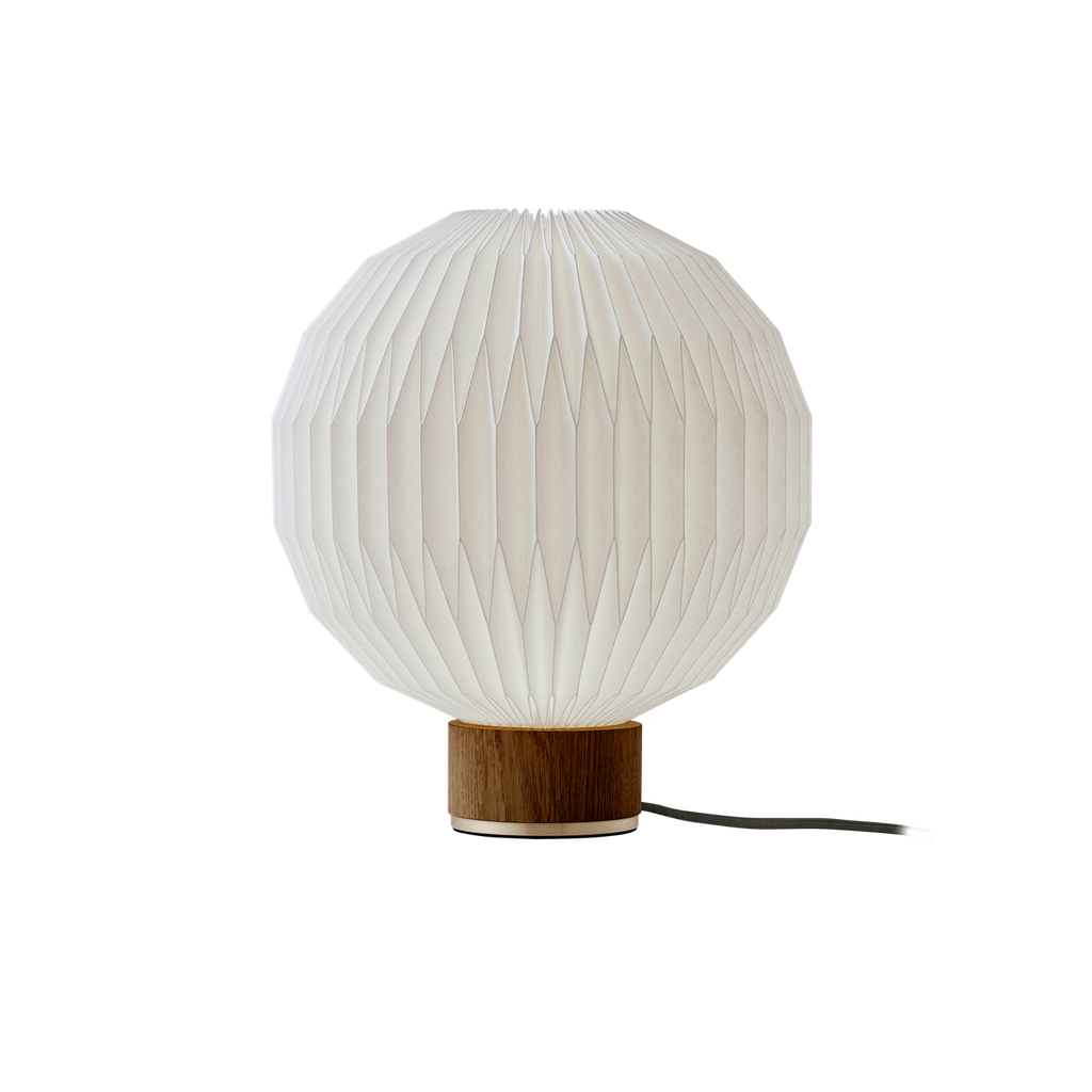 Skærmen, som er den samme, der pryder Model 107, er naturligvis håndfoldet med stor præcision og indgår harmonisk i den elegante fod med messingdetaljer, der fuldender lampens design. Variationen i farverne - lys eg med sandfarvet tekstilledning og røget eg med sort tekstilledning - tilbyder en smuk kontrast, der passer perfekt til både moderne og klassiske indretninger.