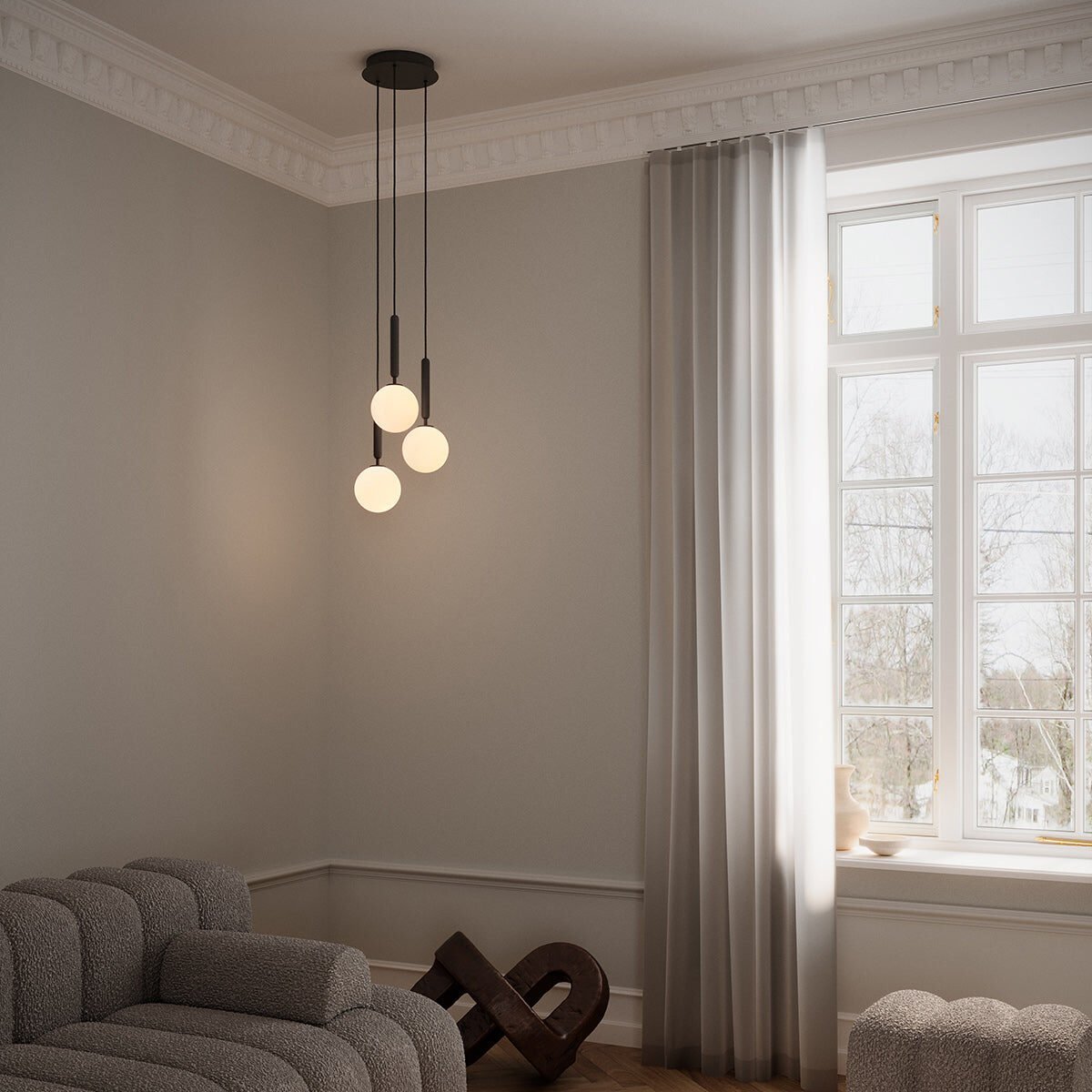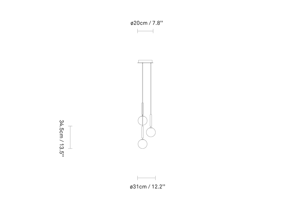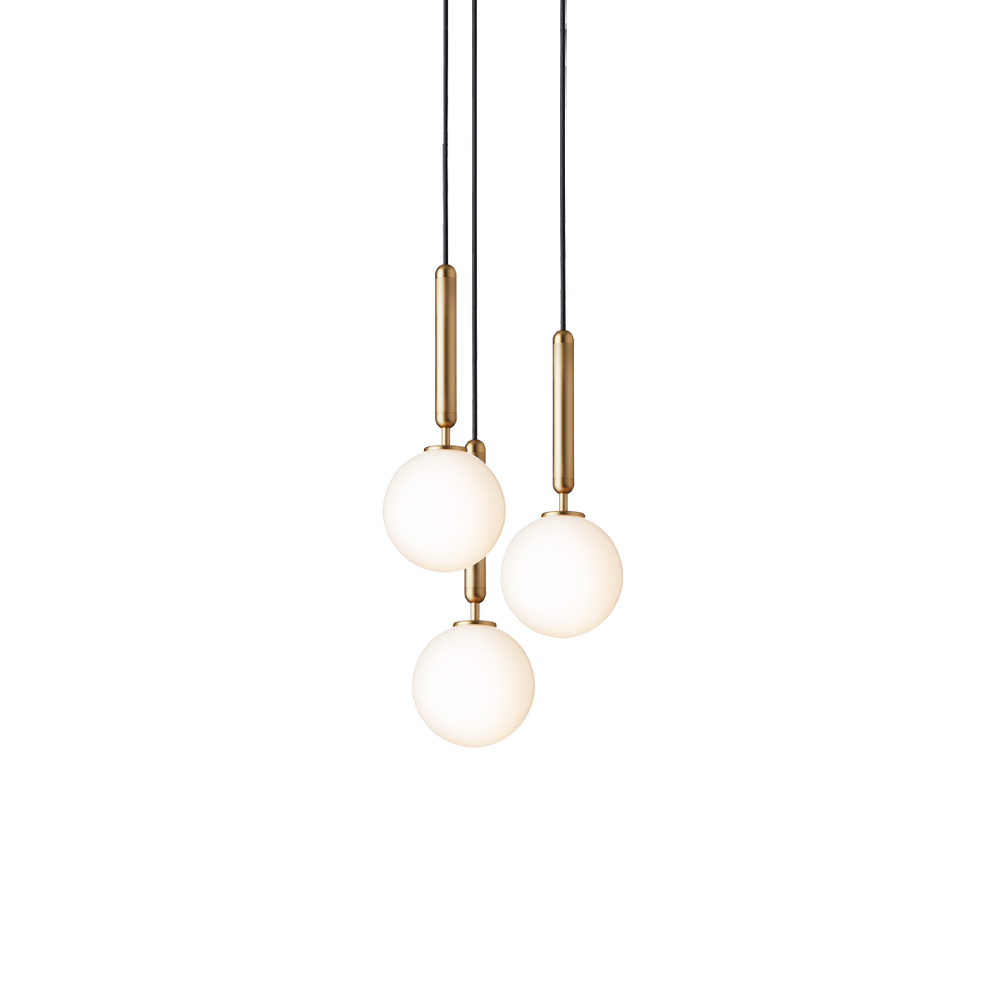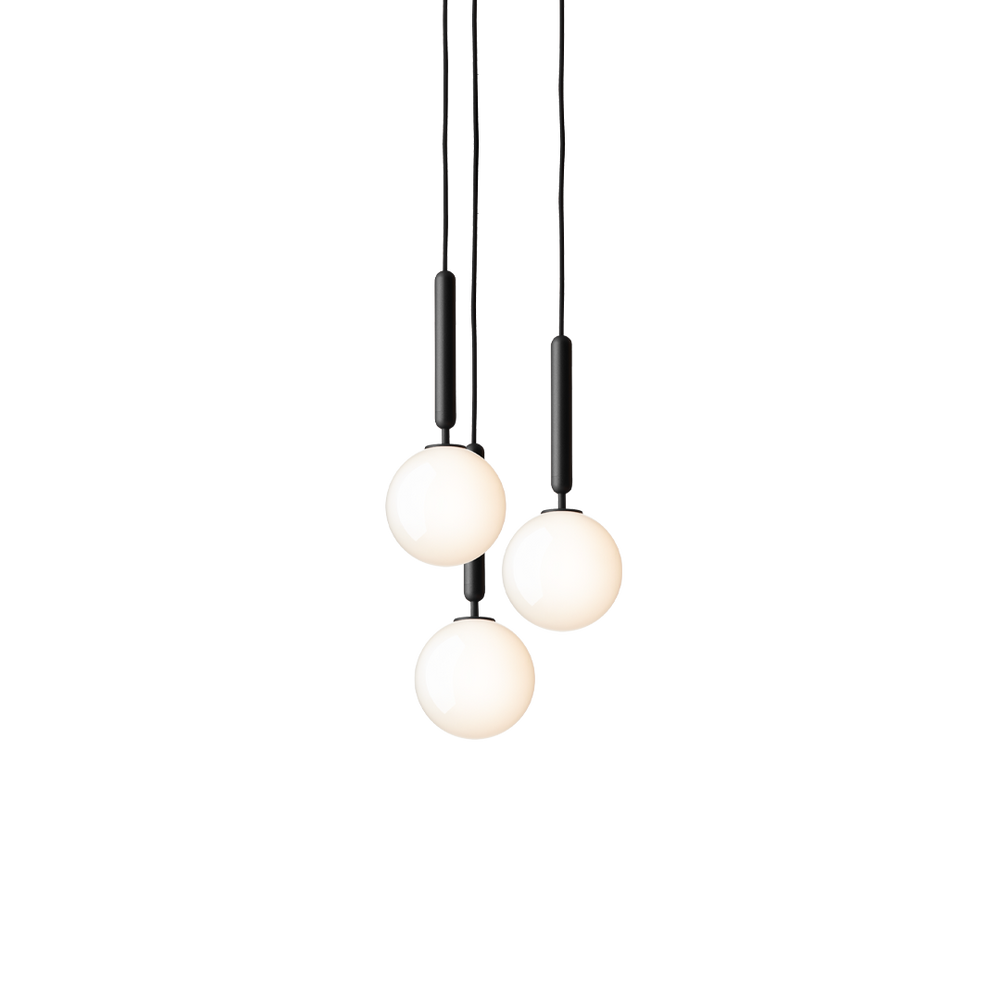 Miira 3 is a chandelier with 3 single pendants attached to a round ceiling plate in a multi-light formation, as the pendants can be adjusted to the desired height. The Miira 3 chandelier has a light and narrow silhouette, creating a floating appearance in the air.