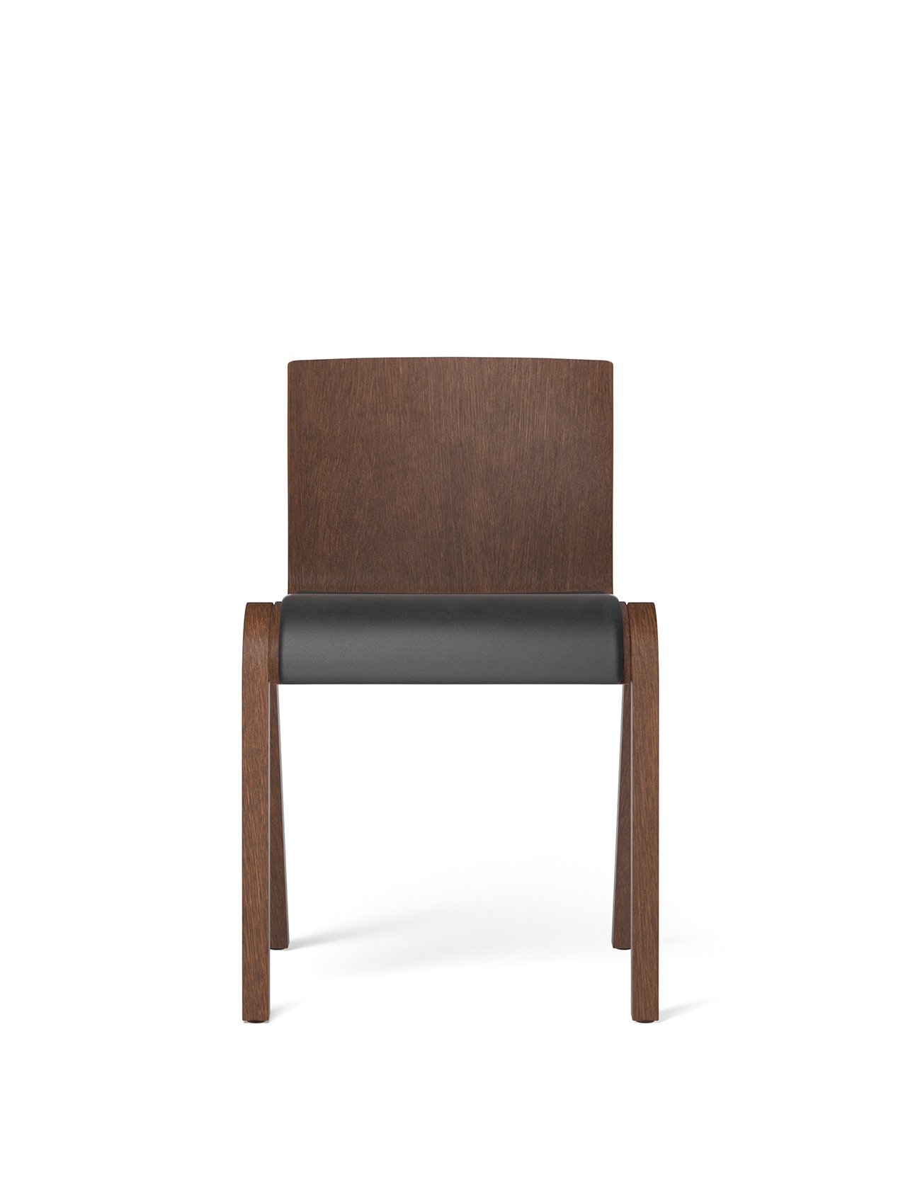 The seat and back are made from press-bent plywood, CNC-cut to shape, then assembled, glued, and lacquered. Available with different base finishes, the design comes in both upholstered and non-upholstered versions.