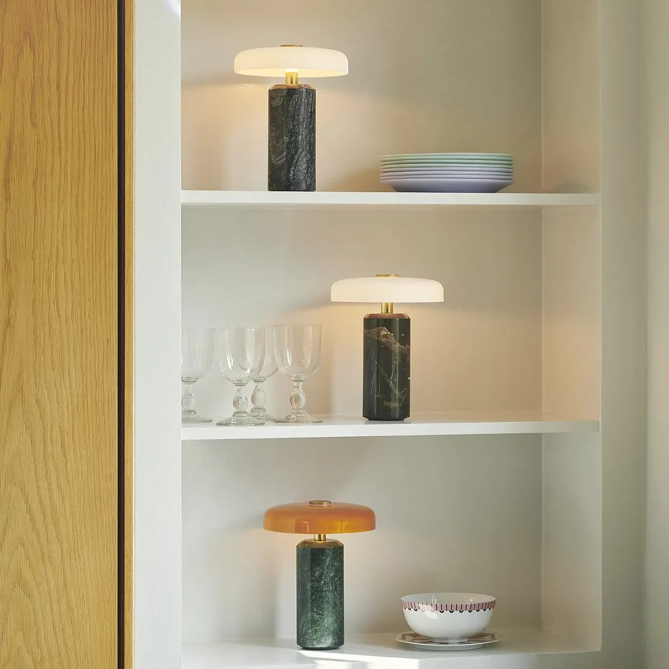 The TRIP portable LED lamp blends elegance and functionality in a cordless design you can use anywhere. Crafted from polished marble and mouth-blown glass, it brings a refined touch to both modern and classic interiors.